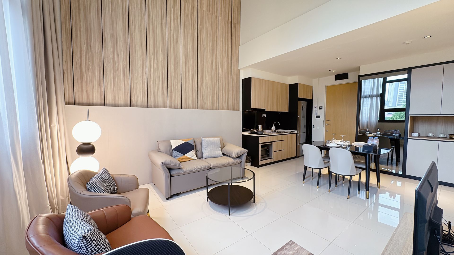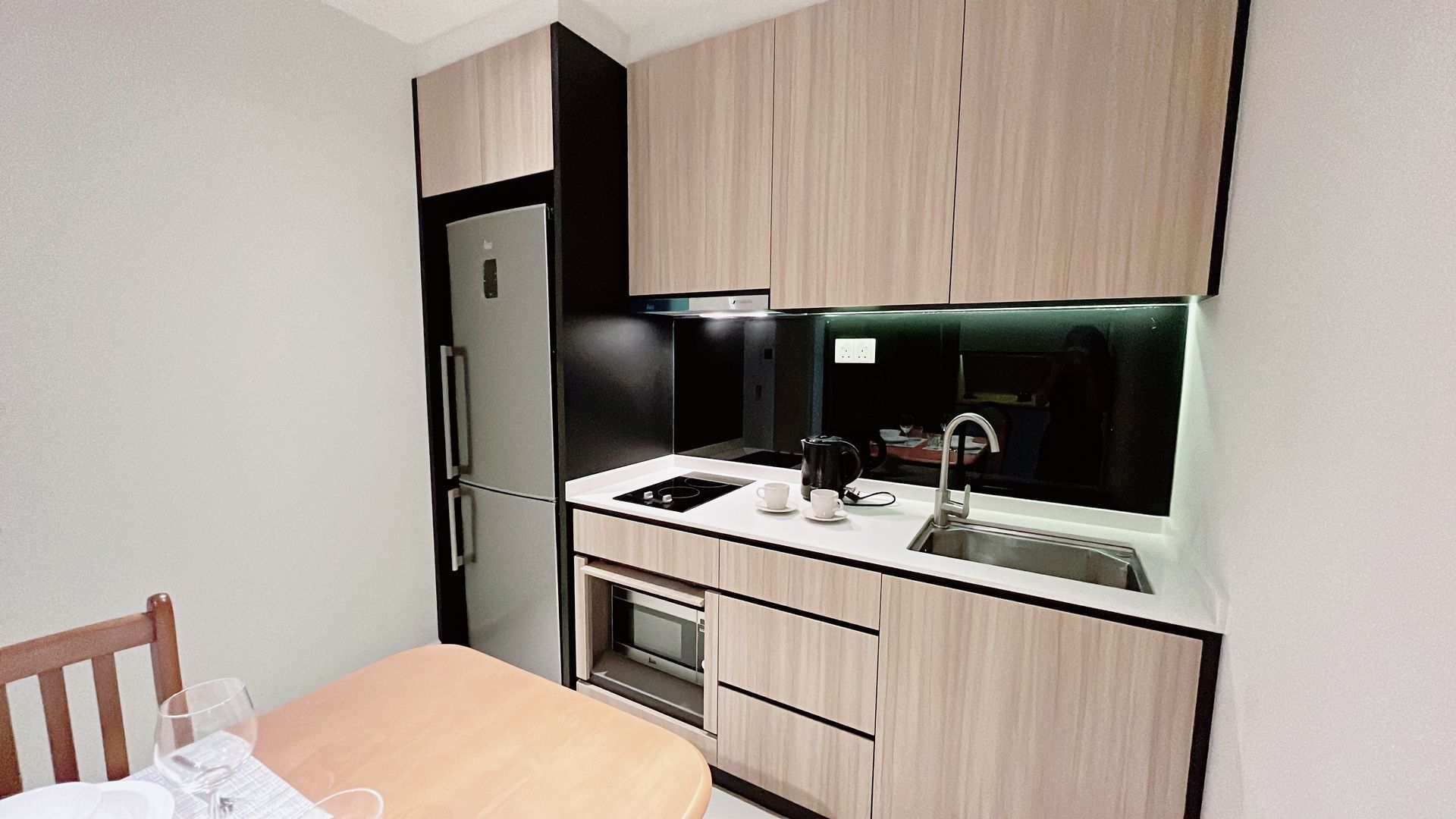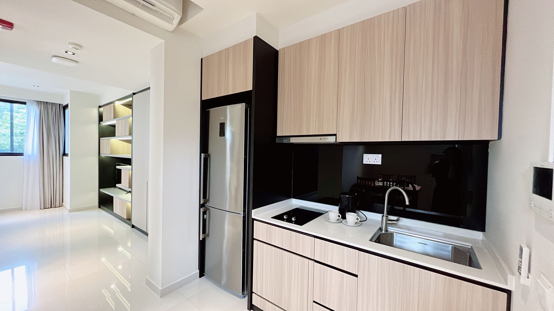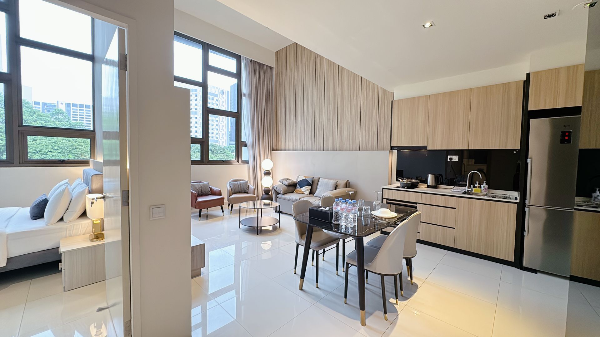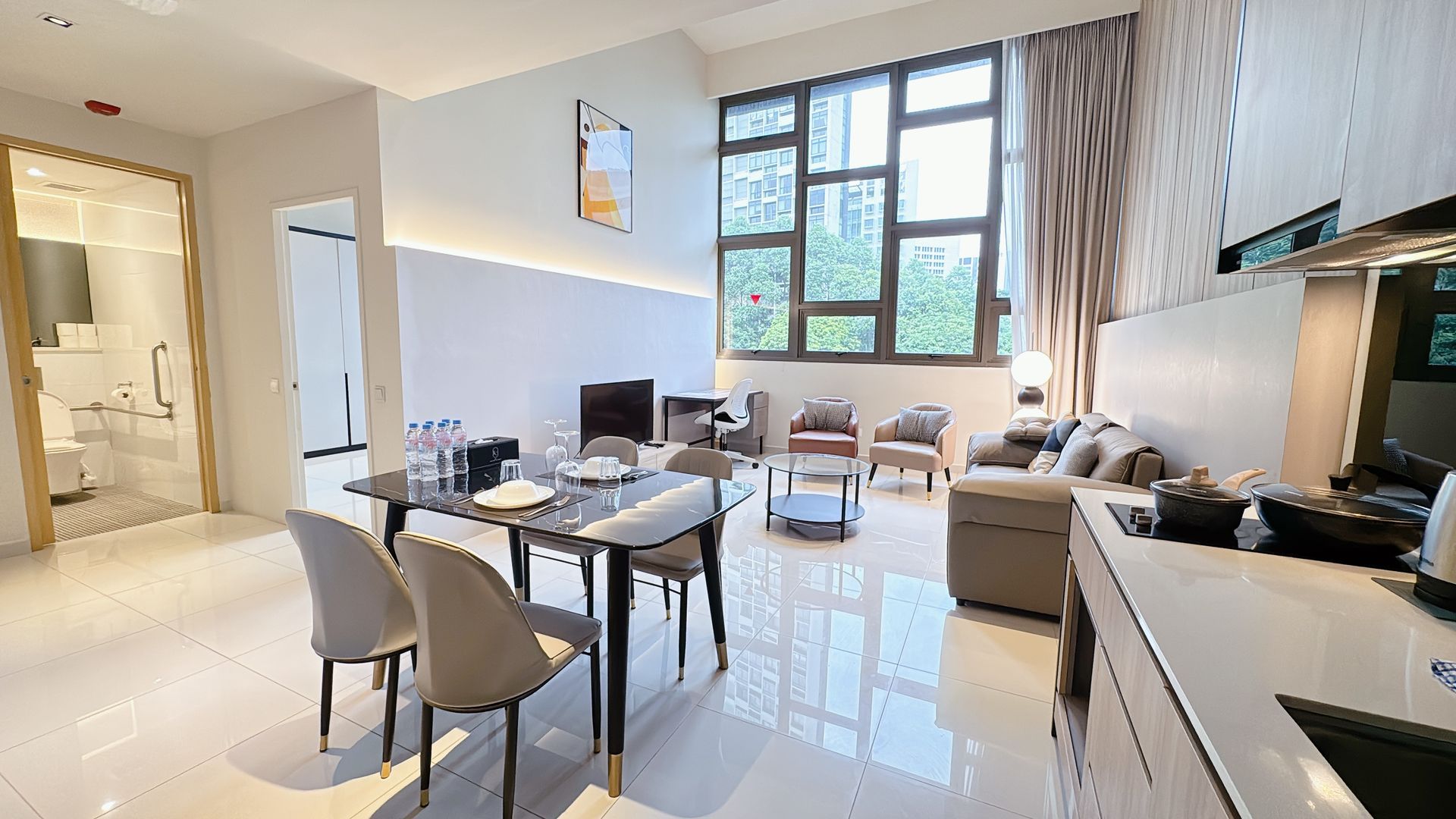 A spacious and well-appointed suite ideal for families or small groups. Features a comfortable queen-size bed, with a sofa bed accommodating up to two additional guests (available at an additional charge), a private kitchenette, and a modern en-suite bathroom with a bathtub and overhead rain shower. The suite is equipped with high-speed Wi-Fi, a washing machine, cooker hob and hood, full-sized fridge, smart TV, air-conditioning, and a dedicated living or dining area—offering comfort and flexibility for both short and extended stays.