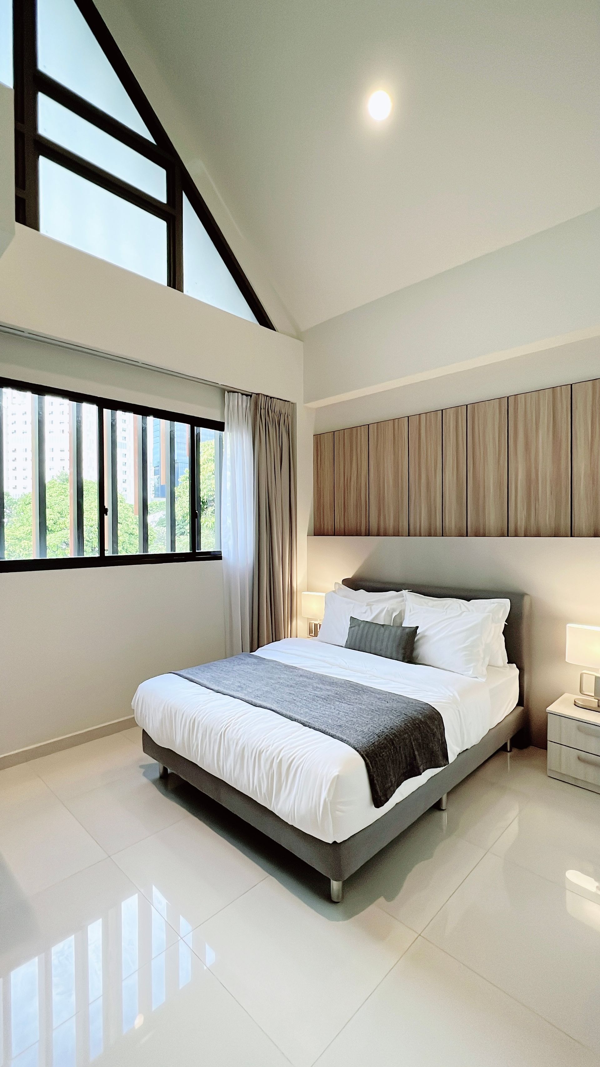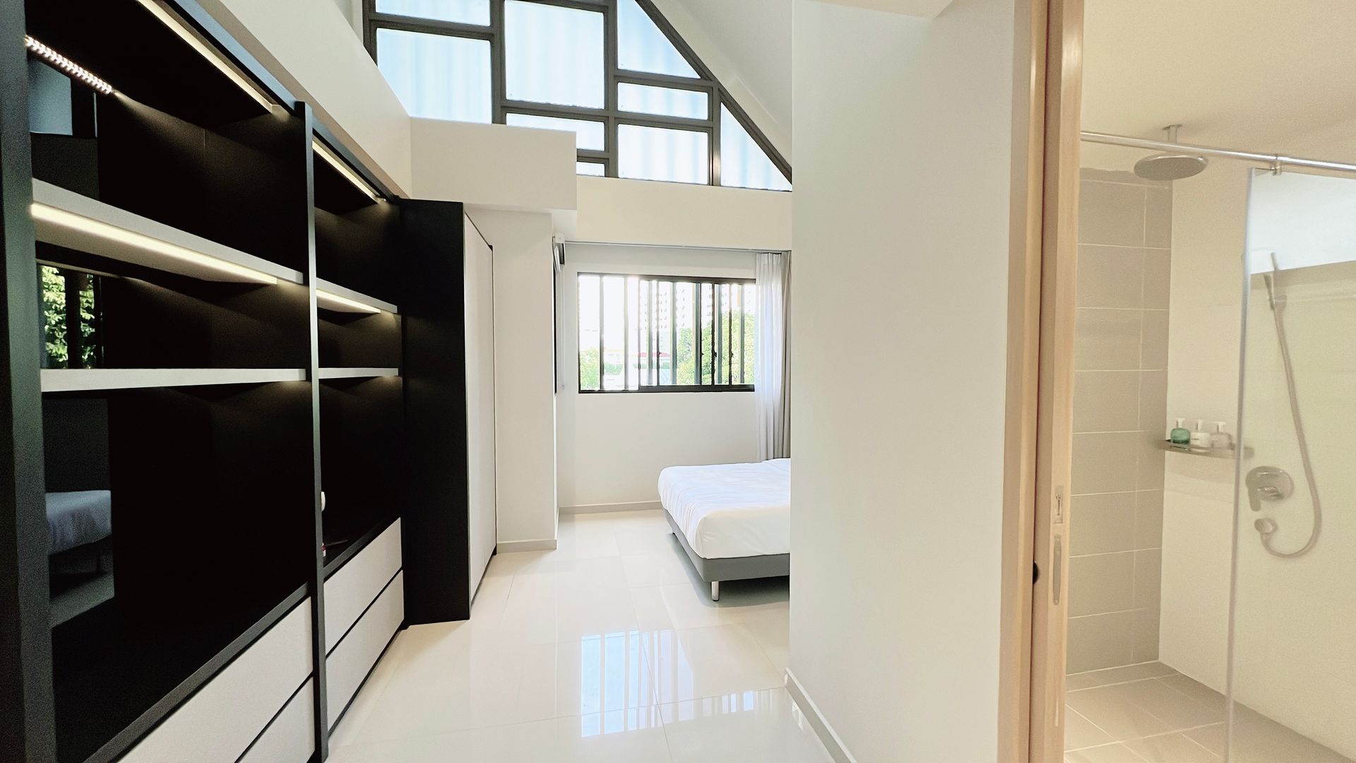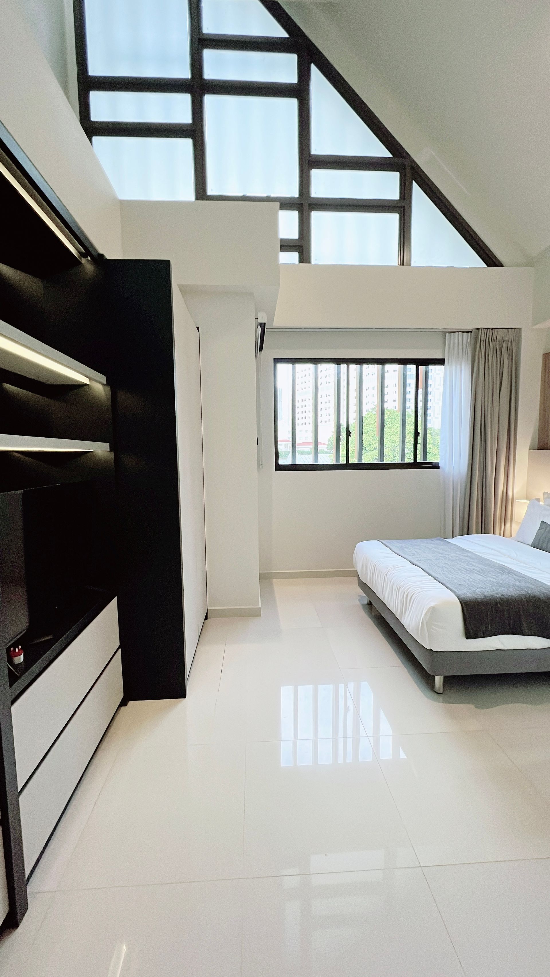 A stylish and comfortable studio ideal for solo travelers or couples, featuring high ceilings that enhance the sense of space and light. Includes a cozy queen-size bed, a private kitchenette, and a modern en-suite bathroom with a walk-in rain shower. The studio is equipped with high-speed Wi-Fi, a washing machine, cooker hob and hood, full-sized fridge, smart TV, air-conditioning, and a compact work/dining area—well suited for both short and extended stays.